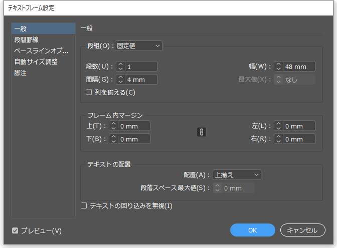 表示される[テキストフレーム設定]ダイアログボックスにて、以下の設定を行うことができます。
