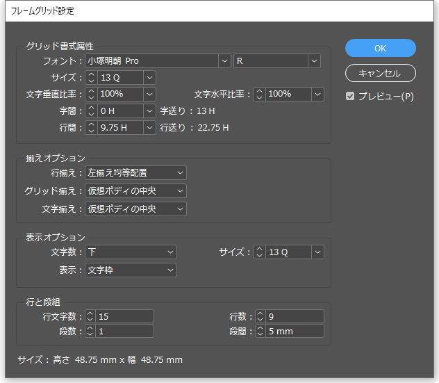フレームグリッドで設定されているフォントの種類や大きさ、行間、字間などを変更することができます。