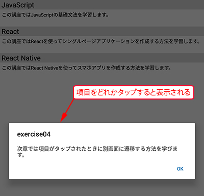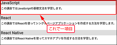 さて、表示する内容は自由に設定できると書きましたがListItemでは「項目をタップすると反応」するようにしています(TouchableOpacityが設定してあります)。スマホアプリではこのように項目をタップすると画面遷移(項目の詳細画面に移動)するというユーザーインターフェースがよく用いられます。次章ではこの画面遷移の方法を学習します。