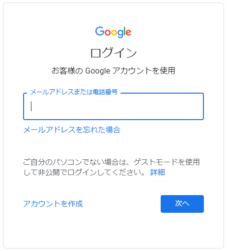 (2)Googleのログイン画面が表示されるのでアカウントのメールアドレス、続いてパスワードを入力します。