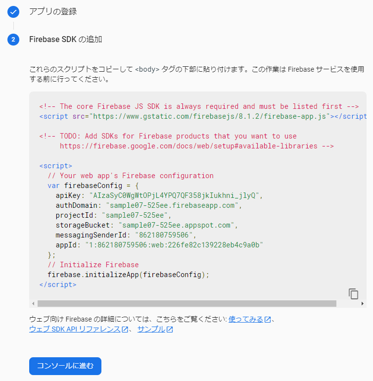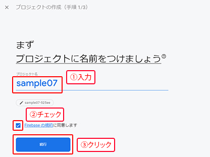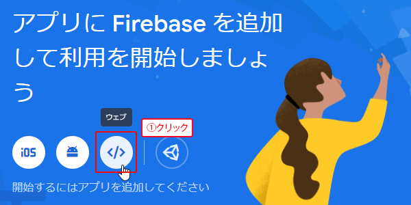 (1)Firebaseのプロジェクト画面で「ウェブ」をクリックします。