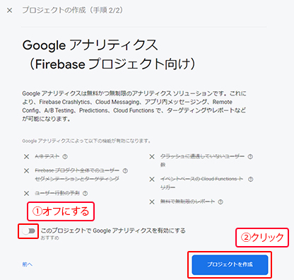 (5)「このプロジェクトでGoogleアナリティクスを有効にする」のトグルをオフにし、「プロジェクトを作成」をクリックします。