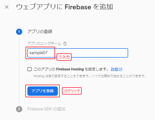 (2)アプリのニックネームを入力し、「アプリを登録」をクリックします。