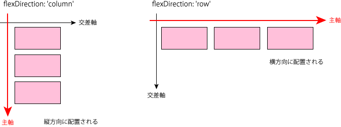 Flexboxの基本となるのは子要素を縦方向(行:column)に配置するのか、横方向(列:row)に配置するのかです。この指定にはflexDirectionプロパティを使用します。flexDirectionで指定された方向を主軸(main axis)、主軸と垂直になる軸を交差軸(cross axis)と言います。子要素を縦方向に配置する場合は主軸は行で交差軸は列、横方向に配置する場合は主軸は列で交差軸は行になります。flexDirectionのデフォルト値はcolumnになります。