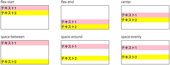 justifyContentプロパティで指定できるのは次の6種類です。なお、子要素を配置させるためにはコンテナ自体にwidthやheightなどで大きさが設定されている必要があります(コンテナ自体に大きさがないと中央寄せとしても結局「詰まった」レイアウトになります)
