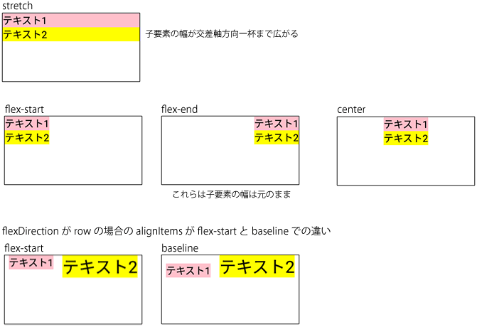 - baseline:ベースラインを揃える(flexDirectionがrowの場合のみ意味がある)