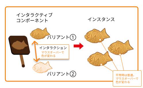 図の例ではもともとの状態をバリアント①、色などを変更した状態をバリアント②としています。