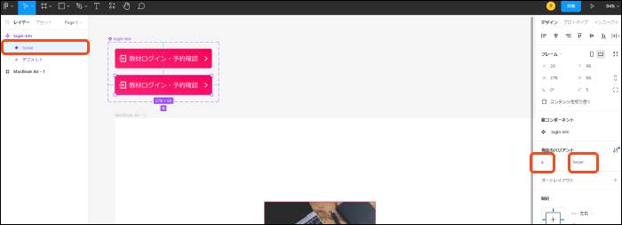 レイヤーパネルのバリアント名が連動してhoverに変わります。レイヤーパネル側でも名称変更が可能ですが、デフォルトのプロパティが連動して変わらず後で手間がかかるのでデザインタブで操作しましょう。