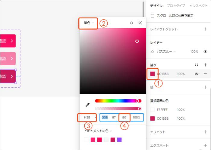 (14)続けて、レイヤーパネルからバリアント[active]を選択し、塗りを選択、[線形]を[単色]に、[Hex]を[HSB]に変更して、3つ目の数値(Brightness:明度)を80に変更します。元のボタンから、明るさを下げた色合いにできました。