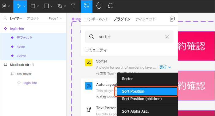 作成した3つのバリアントを選択し、プラグイン[Sorter]を実行して、[Sort Position]を選択します。オブジェクトが配置されている順にレイヤーを並べ替えてくれます。