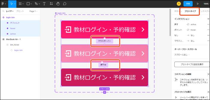 (16)続けてインタラクションを設定します。[プロトタイプタブ]に切り替え、デフォルト(一番上)から、hover(上から2番目)に[マウスオーバー]のインタラクション、hoverからactive(上から3番目)に[押下中]のインタラクションを設定します。インタラクティブコンポーネントの完成です。