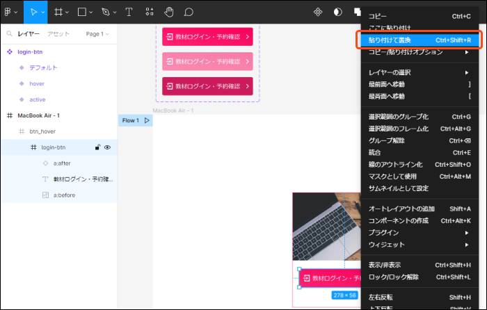 レイヤーパネルからフレーム[login-btn]を選択した状態で、右クリックから[張り付けて置換]を選択します。