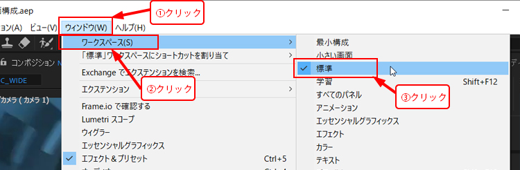 メニューバーの[ウィンドウ]-[ワークスペース]-[標準]が選ばれていることを確認します。