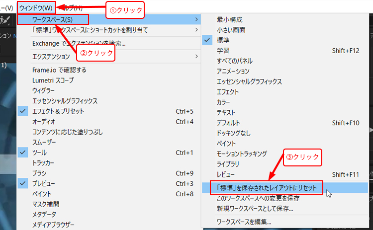 (3)もう一度、メニューバーから[ウィンドウ]-[ワークスペース]-[「標準」を保存されたレイアウトにリセット]と進めます。