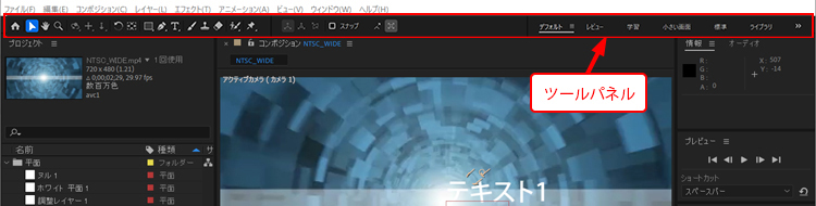 After Effectsの作業領域をワークスペースと呼びます。ワークスペースは複数のパネルで構成されています。